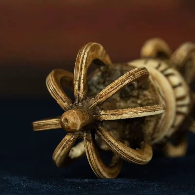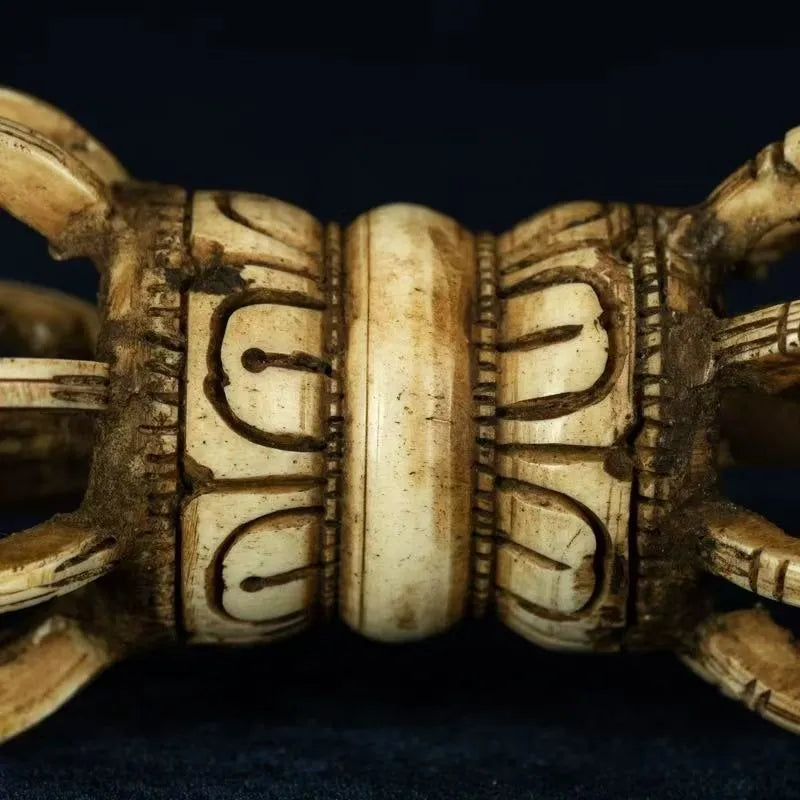 This is an exceptionally special bone-carved nine-pronged Vajra demon-quelling pestle, often used as an intuitive practice ritual instrument during the manifestation of numerous deities. The nine-pronged Vajra symbolizes the "Nine Vehicles" (of Buddhist practice), typically representing the Nine Vehicles of Teachings of Samantabhadra Buddha (the Primordial Buddha of Universal Goodness). In the Nyingma school (Ancient School of Tibetan Buddhism), the nine prongs further signify the Nine Great Vajras and the Nine Unique Endeavors of the Dharma Protectors. This practiced nine-pronged Vajra, having circulated for over a century, has accumulated immense invisible blessed power through time, making it supremely auspicious.