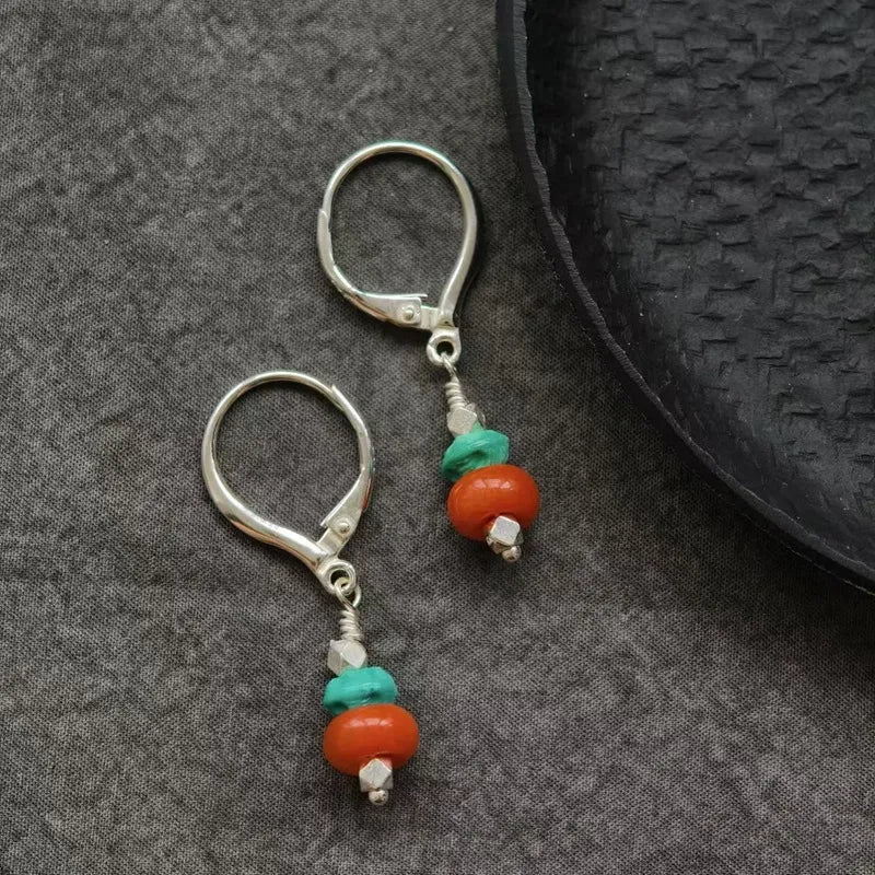 This pair of turquoise and south red earrings embodies the millennial essence of the snowy plateau. In Tibet, turquoise is revered as "tears of the sky," said to form from meltwater of sacred mountains, often placed before Buddha statues, carrying holy energy that guards peace. South red, likened to a "snowland red lotus," its blood-red hue has long been deemed an auspicious talisman to ward off evil and invite fortune.